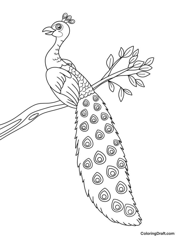 The “Peacock Coloring Pages” capture the elegant and majestic presence of a peacock perched on a branch. Its head is held high, crowned with a delicate crest, and its plumage is full of intricate patterns waiting to burst into a kaleidoscope of color. This image is particularly well-suited for kids, who can appreciate the complexity of the design and use a variety of colors to make it come alive. The distinct ‘eye’ patterns on the tail feathers can be highlighted to show the natural beauty that peacocks are famous for.